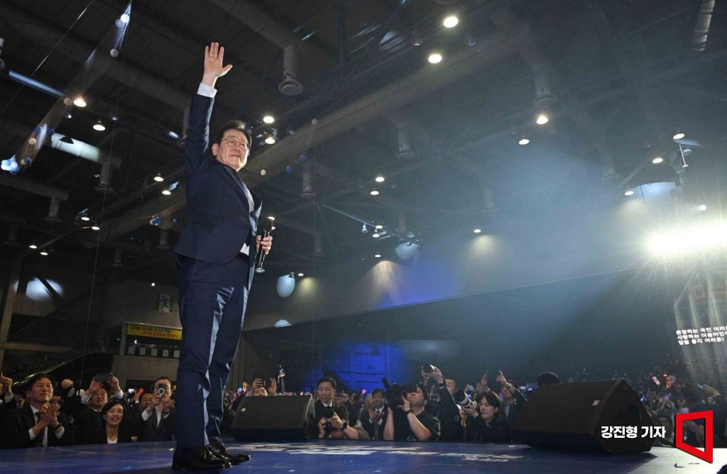 이재명 더불어민주당 경선 후보가 27일 오후 경기 고양시 킨텍스에서 열린 더불어민주당 제21대 대통령선거 후보자 선출을 위한 수도권·강원·제주 합동연설회에 참석해 수락연설에 앞서 지지자들에게 인사하고 있다.