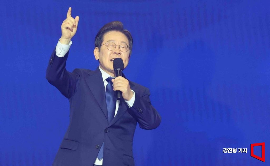 더불어민주당 제21대 대통령선거 후보자 선출을 위한 수도권·강원·제주 합동 연설회가 27일 경기도 고양시 일산 킨텍스 제2전시장에서 열렸다. 대선 후보로 선출된 이재명 전 대표가 수락연설을 하고 있다. 강진형 기자