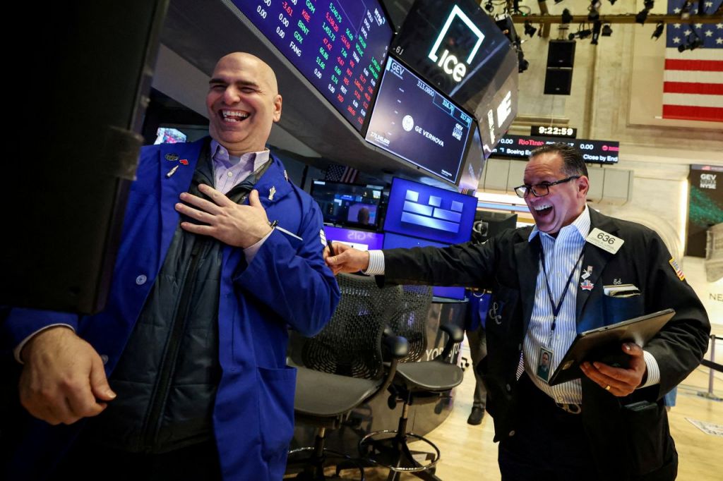 지난 22일(현지시간) 미국 뉴욕증권거래소(NYSE)에서 트레이더들이 업무를 보며 웃고 있다. 로이터연합뉴스