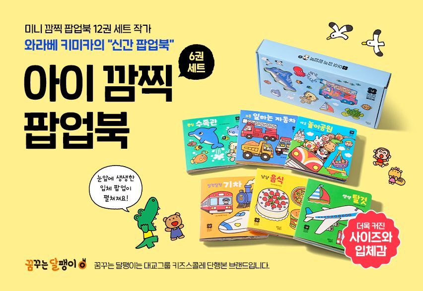 '아이 깜찍 팝업북'은 일본 영유아 팝업북 작가 와라베 키미카의 최신작으로, 꿈꾸는 달팽이 베스트셀러 '미니 깜찍 팝업북'의 새로운 팝업 시리즈다. 놀이공원, 음식, 수족관 등 6종의 팝업북으로 구성됐으며, 키즈스콜레가 국내 최초로 독점 계약을 체결해 선보인다.