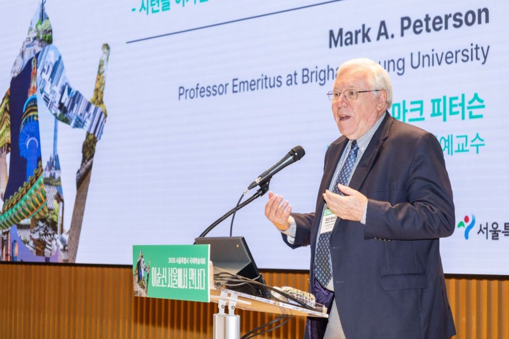 마크 피터슨 미 브리검영대 명예교수가 25일 서울시청에서 열린 이순신 탄신 480주년 기념 국제학술대회에서 기조강연을 하고 있다. 서울시 제공