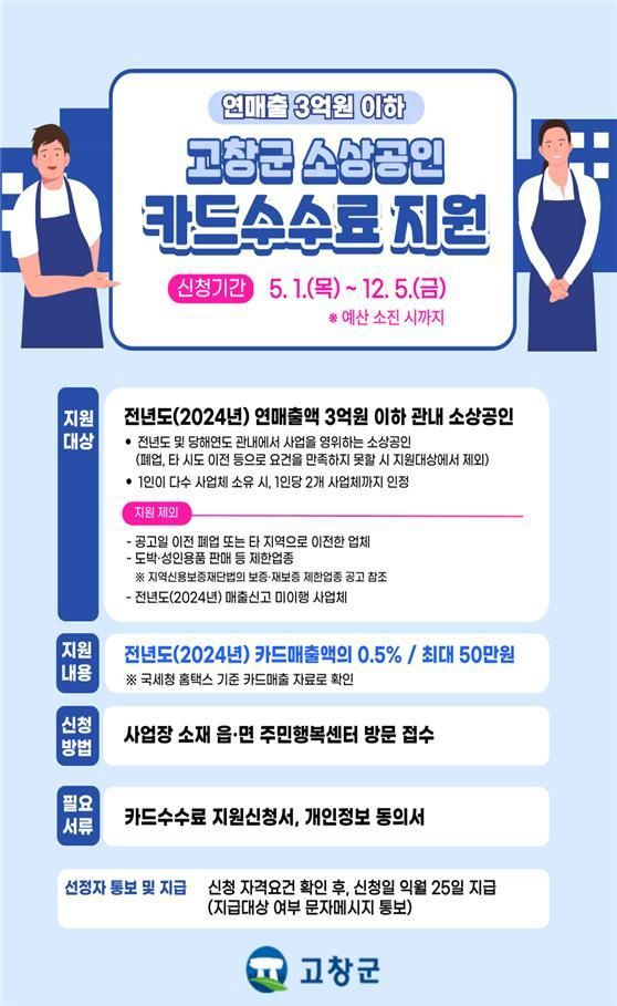 지원 대상은 전년도(2024년도) 연 매출 3억원 이하의 고창군 내 소상공인이다. 카드 매출액의 0.5%에 해당하는 카드수수료를 최대 50만원까지 지원한다.