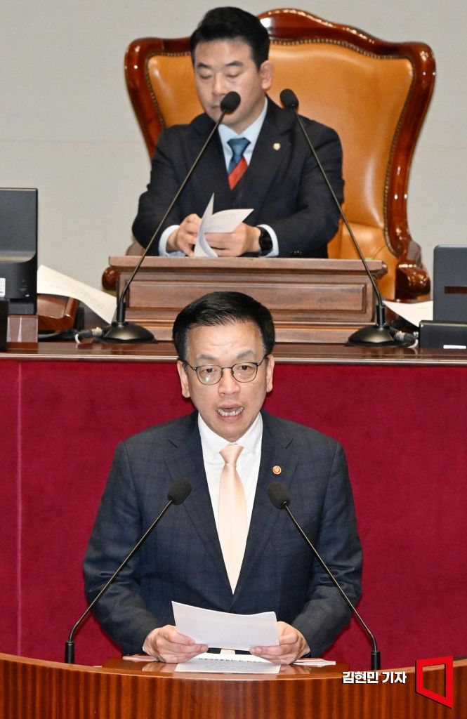 최상목 경제부총리 겸 기획재정부 장관이 28일 국회에서 열린 예산결산특별위원회에서 제안설명을 하고 있다. 이날 회의에는 정부가 제출한 12조 2천억원의 추가경정예산(추경)안을 심사하는 종합정책질의를 진행한다.