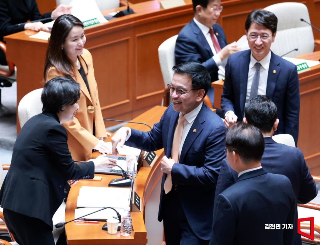 최상목 경제부총리 겸 기획재정부 장관이 28일 국회에서 열린 예산결산특별위원회에서 의원들과 인사하고 있다. 이날 회의에는 정부가 제출한 12조 2천억원의 추가경정예산(추경)안을 심사하는 종합정책질의를 진행한다.
