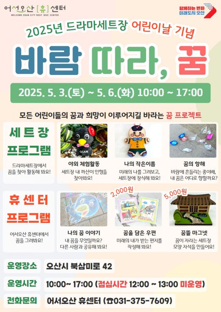 경기도 오산시는 어린이날을 맞아 다음 달 3일부터 6일까지 4일간 내삼미동 소재 '오산 드라마세트장'에서 '바람 따라, 꿈' 프로그램을 운영한다고 28일 밝혔다.