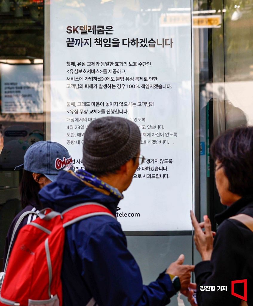 28일 서울 마포구 한 SK텔레콤 공식 인증 대리점을 찾은 고객들이 유심을 교체하기 위해 기다리고 있다. SK텔레콤은 오늘부터 가입자들에게 유심 무료 교체서비스를 제공할 예정이다.