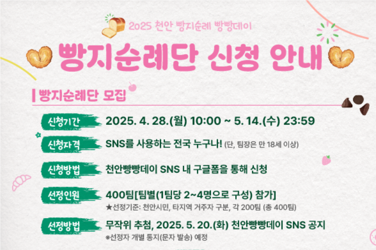 빵지순례단은 6월 14일부터 15일까지 열리는 빵지순례 빵빵데이에 참여하는 빵집 중 지정 빵집 2개소와 천안 8경 중 1개소 이상을 방문해 개인 SNS에 올리는 체험단이다.