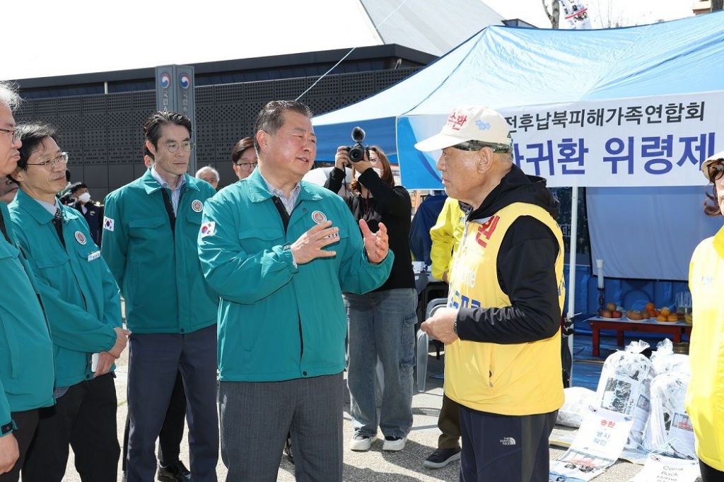 김경일 파주시장이 지난 23일 최성룡 납북자가족모임 대표와 이야기를 나누고 있다. 파주시 제공