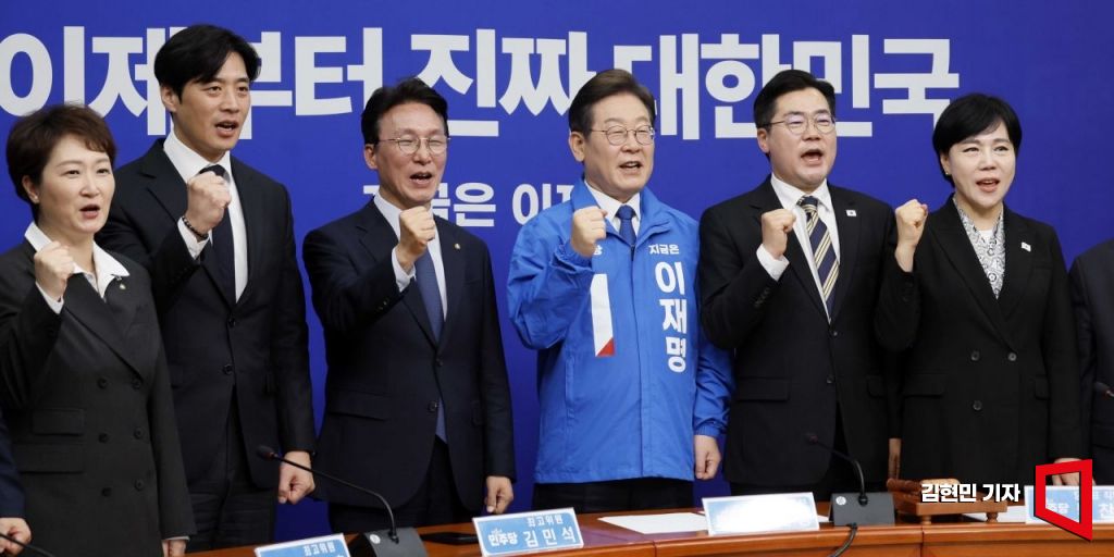 이재명 더불어민주당 대선 후보가 28일 국회에서 열린 최고위원회의에서 선거용 점퍼를 입고 최고위원들과 화이팅을 외치고 있다.