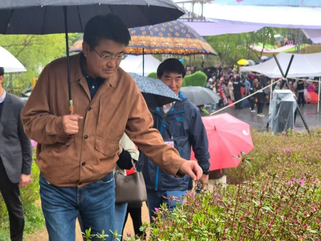 오승록 노원구청장이 불암산 철쭉축제를 앞두고 철쭉 상황을 살펴보고 있다.