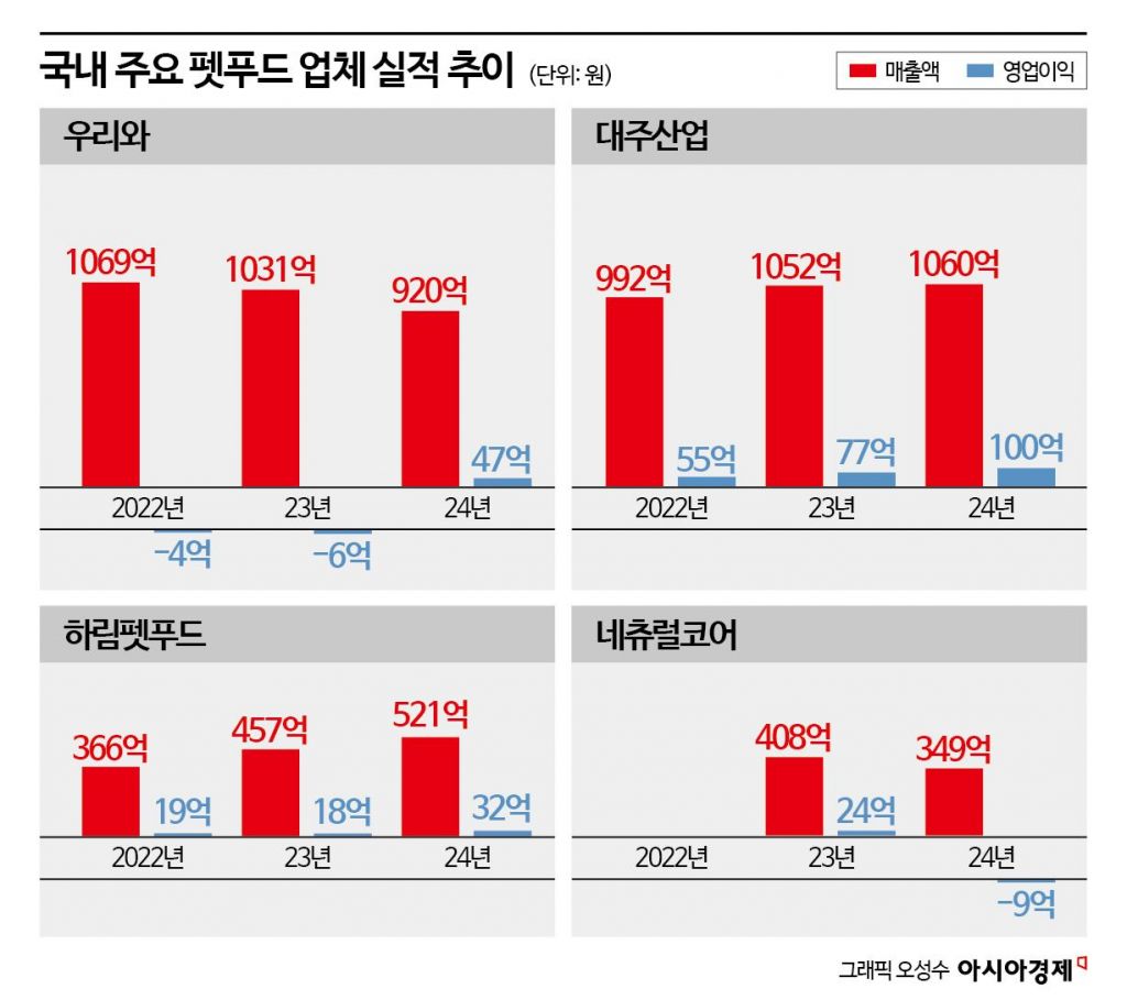국내 주요 업체들도 반려동물 산업의 성장 속에 볼륨을 키우고 있지만 상대적 열세는 면치 못하고 있다. 'ANF' '웰츠' 등의 브랜드를 판매하는 우리와는 지난해 영업이익 47억원으로 흑자 전환했지만 매출액은 920억원으로 전년(1031억원) 대비 10.8% 줄었다. 같은 기간 네츄럴코어도 매출이 14.5% 감소한 345억원을 기록했다. 반면 하림펫푸드는 전년 대비 매출이 14.0% 증가하며 처음으로 500억원을 넘어섰고, '캐츠랑' '도그랑' 등 반려동물 사료 외에 양축사료도 함께 제조·판매하는 대주산업은 영업이익 100억원을 넘기며 선전했다.