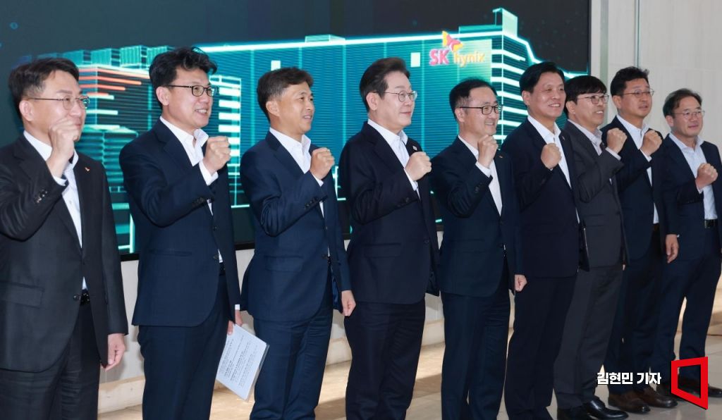 이재명 더불어민주당 대선 후보(왼쪽 네 번째)가 28일 경기 이천시 SK하이닉스를 방문해 곽노정 CEO(왼쪽 세 번째) 등 관계자와 기념촬영을 하고 있다.