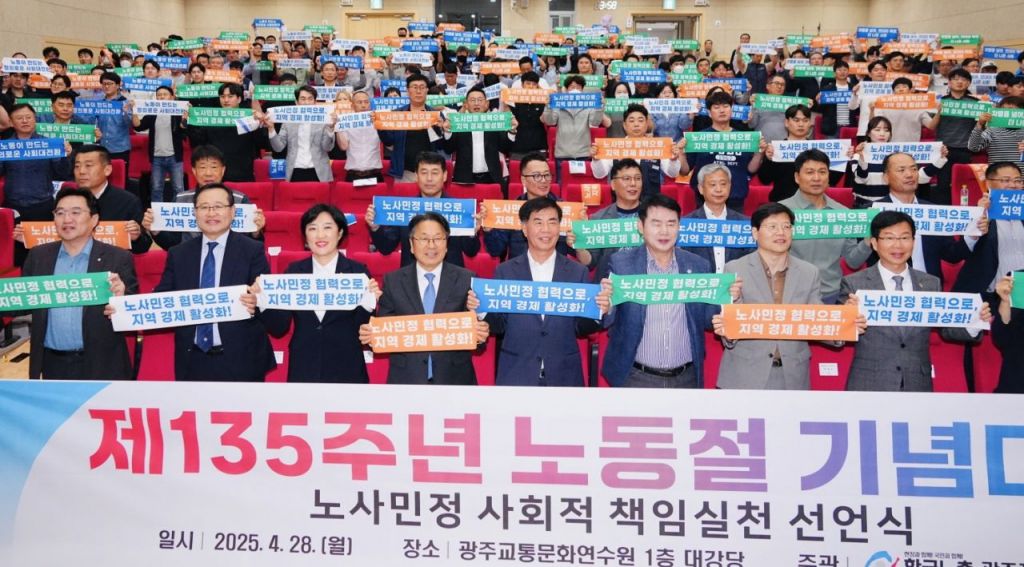 강기정 광주시장이 28일 광주교통문화연수원 대강당에서 열린 '제135주년 노동절' 기념행사에 참석, 기념 촬영을 하고 있다. 광주시 제공