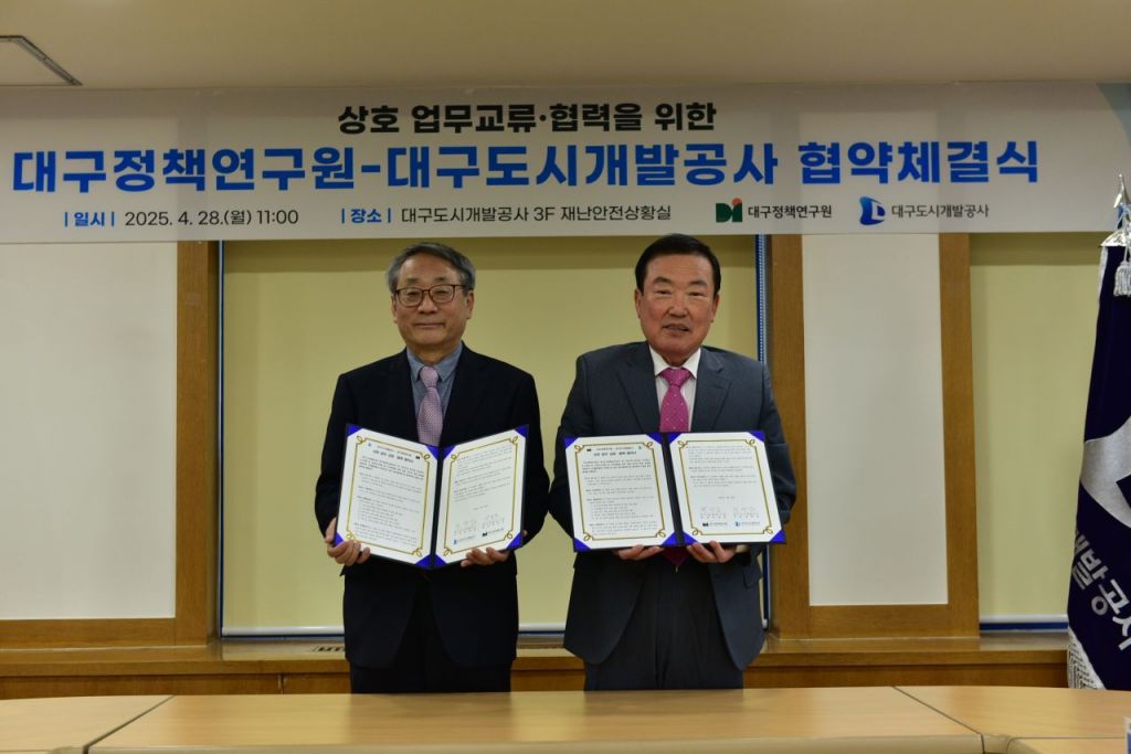 대구도시개발공사(사장 정명섭)와 대구정책연구원(원장 박양호)은 지역개발 및 지역 활성화를 위한 공동 연구와 정책 개발을 위해 상호 협력하기로 합의하고, 28일 대구도시개발공사 본사에서 업무협약(MOU)을 체결했다.