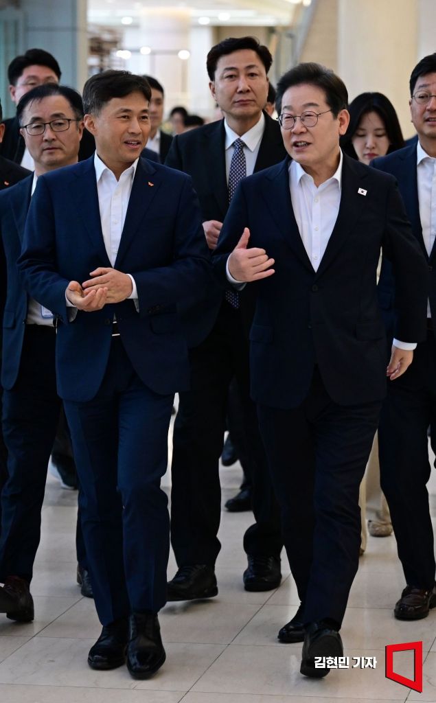 이재명 더불어민주당 대선 후보와 곽노정 SK하이닉스 대표이사 사장이 28일 오후 경기도 이천시 SK하이닉스 이천캠퍼스에서 'K-반도체' AI메모리반도체 기업 간담회를 위해 만나 대화하며 걷고 있다. 2025.4.28 김현민 기자