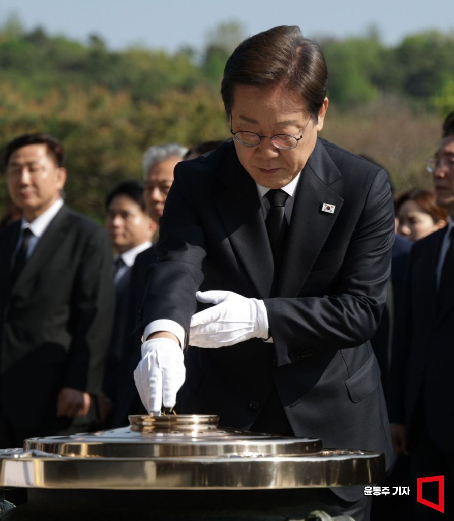 이 후보는 28일 오전 서울 동작구 국립현충원을 찾아 전직 대통령의 묘역을 참배로 당 대선 후보로서의 첫 일정을 시작했다. 김대중 전 대통령의 묘역은 물론 보수 진영의 이승만·박정희 전 대통령의 묘역을 참배했다. 중도를 넘어 보수층의 표도 끌어오기 위함으로 읽힌다.