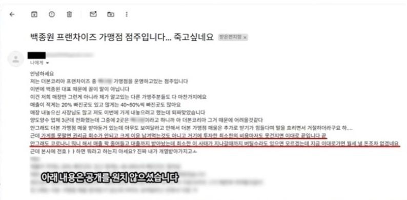 유튜브 '아라보쟈' 채널은 지난 27일 백종원 대표와 관련해 제보받은 메일을 공개했다. '백종원 프랜차이즈 가맹점 점주입니다. 죽고 싶네요'라는 제목의 메일에는 '이번에 백종원 대표 때문에 꼴이 말이 아니다'라는 하소연이 담겼다. 가맹점주는 "저희 매장만 그런 게 아니라 다른 가맹점주들도 다 마찬가지다"라며 "매출이 적게는 20% 빠진 곳도 있고 많게는 40~50% 줄어든 곳도 많다"라고 전했다.