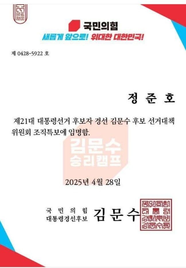 김문수 국민의 힘 후보가 정준호 의원을 선거조직특보로 임명한다는 내용의 임명장. 정준호 의원 페이스북 캡쳐