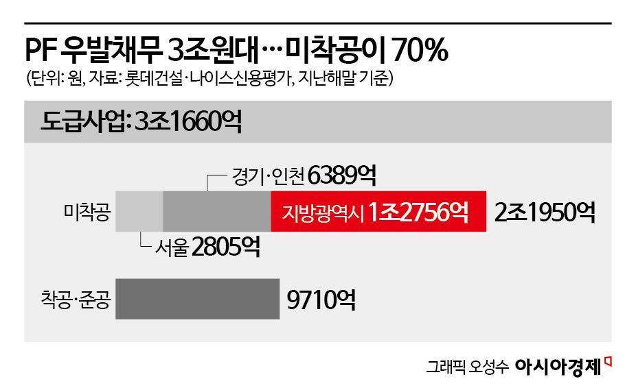 롯데건설 PF 우발채무 가운데 도급사업 규모는 지난해 말 기준 3조1660억원이다. 이 중 위험 수준이 높은 미착공 PF 보증이 2조1950억원(69%)에 달한다. 미착공 PF 보증 사업장은 수도권(9194억원)보다 지방(1조2756억원)에 많다. 또 착공 및 준공 사업(9710억원) 가운데 분양률이 70% 미만인 사업장은 2318억원 규모에 이른다.