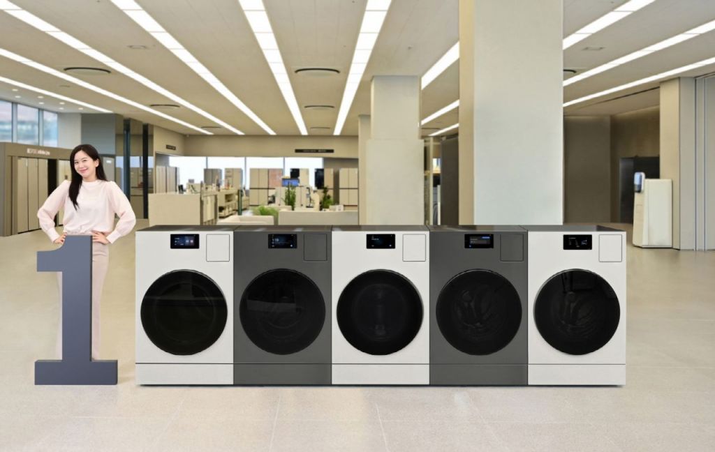 삼성전자 모델이 국내 누적 판매량 10만대를 돌파한 '삼성전자 AI 콤보' 세탁건조기를 소개하고 있다. 삼성전자