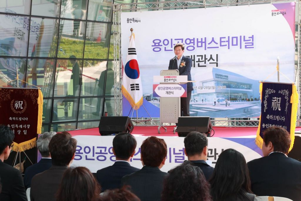 이상일 용인시장이 28일 열린 '용인공영버스터미널' 개관식에서 인사말을 하고 있다. 용인시 제공