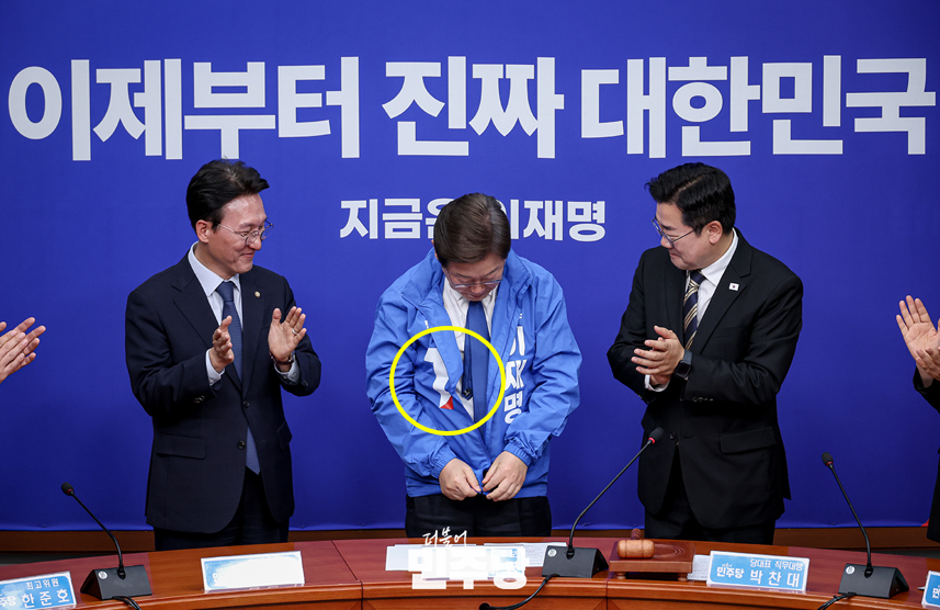 이 후보가 당대표실에 들어오자 박찬대 당대표 직무대행 겸 원내대표는 '더불어민주당 1 지금은 이재명'이라고 적힌 파란색 당 점퍼를 입혀줬는데, 기호 1번 숫자 귀퉁이가 빨간색으로 칠해져 있었다. 국민의힘을 상징하는 색상이다.