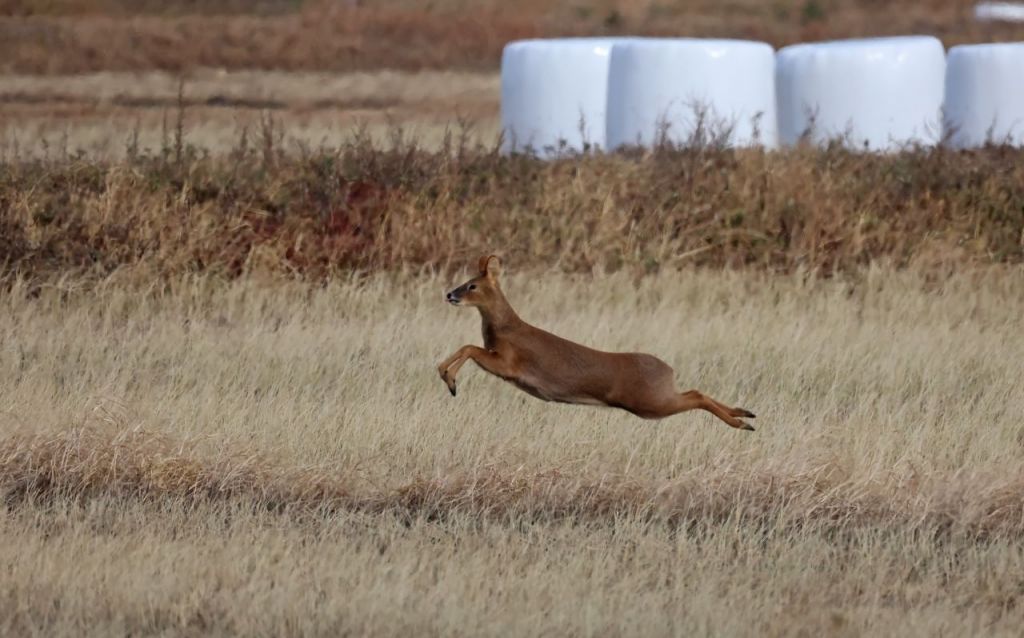 강원 강릉시 연곡면의 수확이 끝난 들녘에서 고라니가 자유롭게 뛰어다니고 있다. 연합뉴스