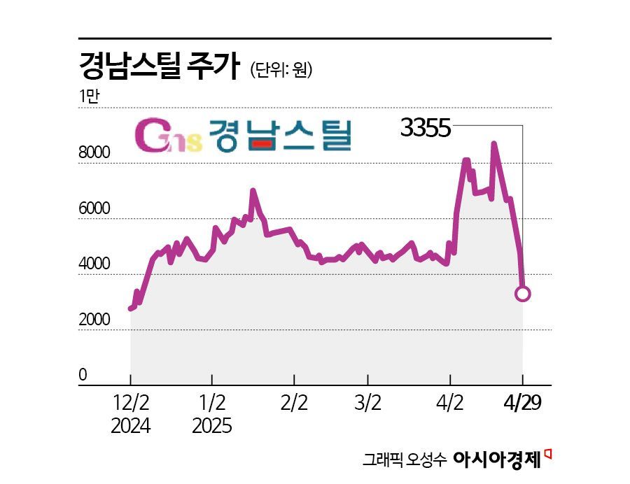 30일 금융투자 업계에 따르면 개인은 이달 들어 전날까지 경남스틸 주식을 91억원어치 사들였다. 평균 매수 단가는 7029원으로 전날 종가 3355원을 기준으로 평가 손실률 -52.3%를 기록했다.