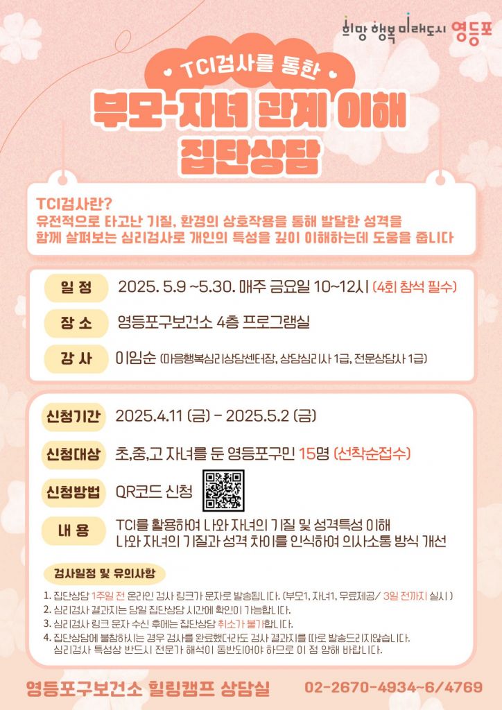영등포구(구청장 최호권)가 부모와 자녀 간 건강한 관계 형성을 돕기 위해 'TCI 검사를 활용한 부모 집단상담' 프로그램을 운영한다고 밝혔다.