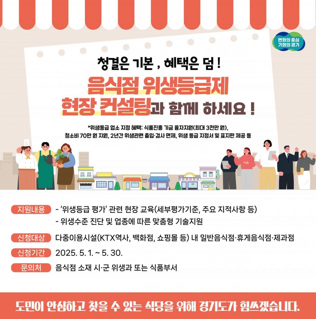 경기도가 소비자식품위생감시원과 함께 음식점 위생등급제 무료 현장 컨설팅을 진행한다. 안내 포스터. 경기도 제공