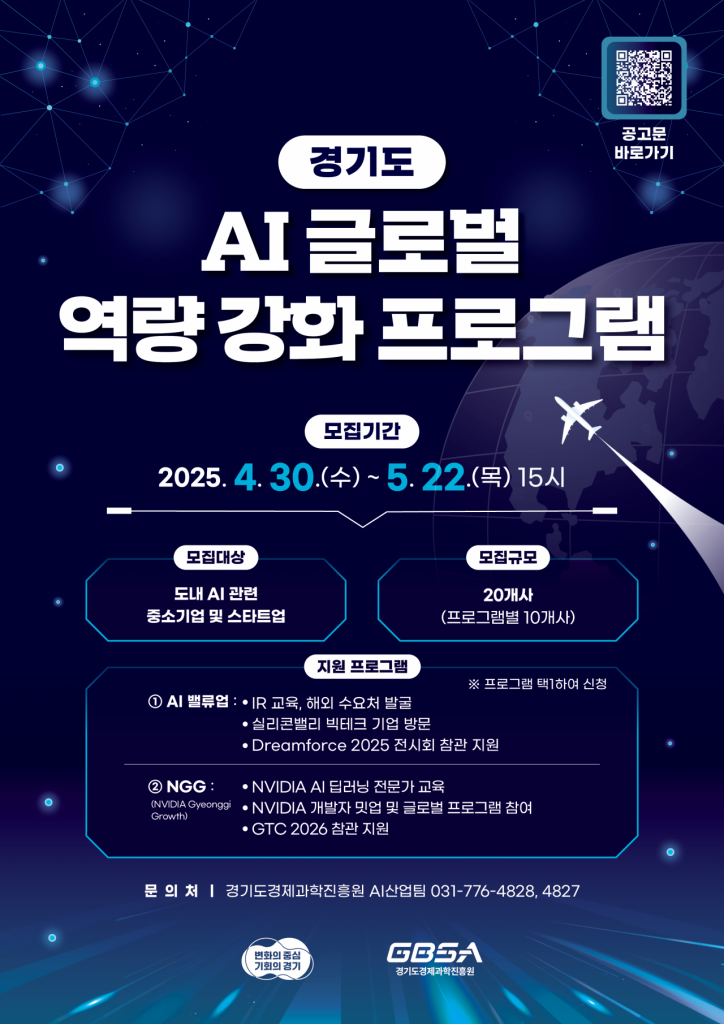 프로그램은 'AI 밸류업'과 'NGG(NVIDIA Gyeonggi Growth)' 등 2개며 주제 별 10개 기업을 선정해 맞춤형 글로벌 진출 기회를 제공한다.