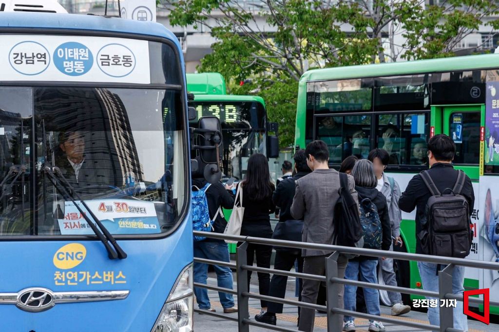 서울 시내버스 노사 간 협상이 결렬되면서 노조가 준법운행 쟁의행위에 돌입한 30일 서울 중구 서울역버스환승센터 버스에 쟁의행위 관련 안내문이 부착돼 있다.