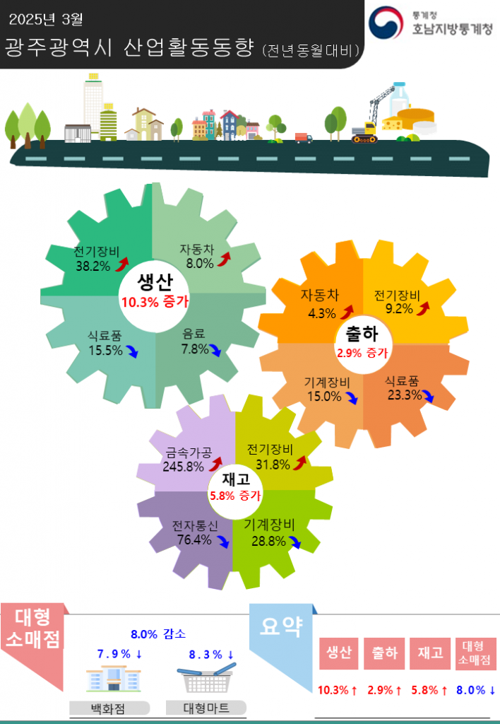 호남지방통계청 관계자는 "3월 광주는 전기장비와 자동차 중심으로 제조업 생산이 증가했지만, 소비는 둔화된 흐름을 보였고, 전남은 생산과 소비 모두 전년 대비 감소한 것으로 나타났다"고 설명했다.