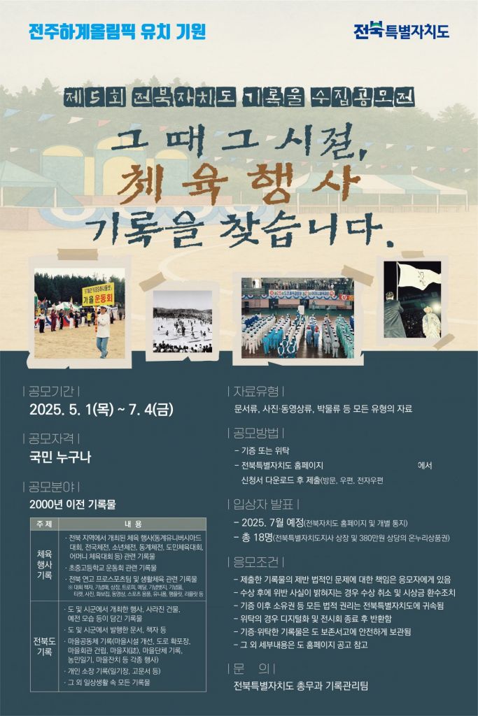 '그때 그 시절, 체육행사 기록을 찾습니다'를 주제로 진행되는 공모전은 전북 지역에서 개최된 대규모 체육대회, 체육행사, 학창 시절 운동회 등의 기록물을 수집할 계획이다.