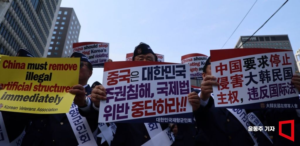 재향군인회 회원들이 30일 서울 중구 중국대사관 인근에서 서해에 설치된 인공조물 설치 규탄 집회를 갖고 있다.