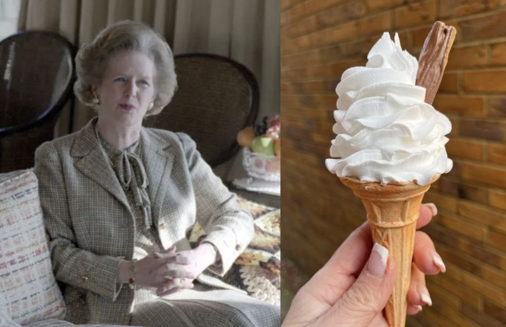 노란 옥수수 콘 위에 올린 부드러운 아이스크림. 한국에선 소프트 아이스크림, 영미권에선 소프트 서브라고 불린다. 영국 및 영연방에선 이 제품과 관련해 굳어진 오해가 있다. 바로 마거릿 대처 영국 전 총리가 소프트아이스크림의 핵심 원료를 발명했다는 설이다. 대처 전 총리가 아이스크림 기계 개발 업체에서 화학 엔지니어로 일한 경험이 있는 만큼 이를 믿는 사람들이 많았다.