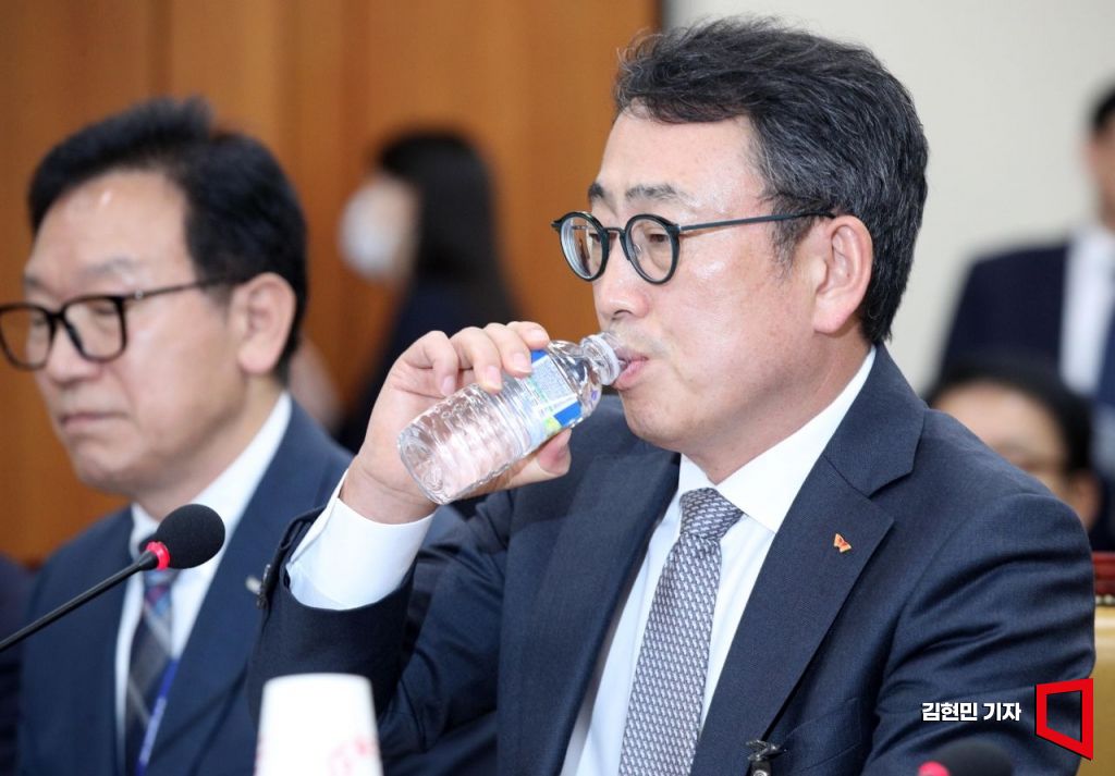 유영상 SK텔레콤 대표이사가 30일 국회 과학기술정보방송통신위원회의에서 열린 방송·통신 분야 청문회에 참석해 물을 마시고 있다.