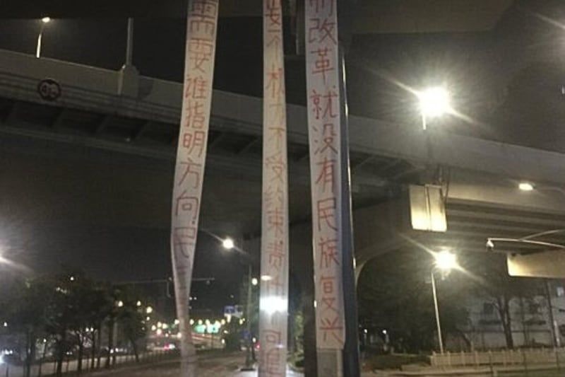 지난 15일 새벽 중국 남부 쓰촨성 청두의 한 고가도로에 중국의 현 정치체제를 비판하는 내용의 대형 현수막 3장이 걸렸다. X 캡처