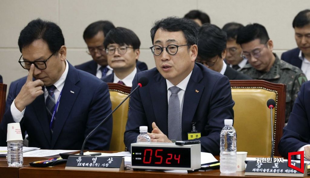 유영상 SK텔레콤 대표이사가 30일 국회 과학기술정보방송통신위원회의에서 열린 방송·통신 분야 청문회에서 의원 질의에 답변하고 있다. 김현민 기자