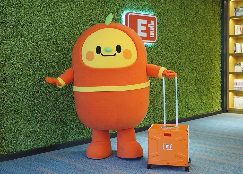 E1이 다음 달 1일부터 31일까지 오렌지카드 회원 대상 1000포인트 특권 사은행사를 실시한다. 사진은 E1 마스코트인 티티가 폴딩카트 옆에 서 있는 모습. E1