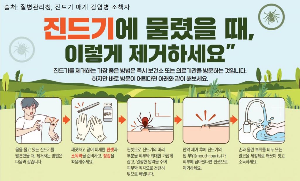 진드기에 물렸다면 깨끗하고 끝이 미세한 핀셋으로 진드기의 머리 부분을 피부와 최대한 가깝게 잡은 후 일정한 압력을 줘 피부와 직각으로 천천히 빼내야 한다. 제거 후 진드기 입 부위가 피부에 남아있다면 핀셋으로 제거하고, 손과 물린 부위를 비누나 알코올 세정제로 깨끗이 씻고 소독하면 된다.