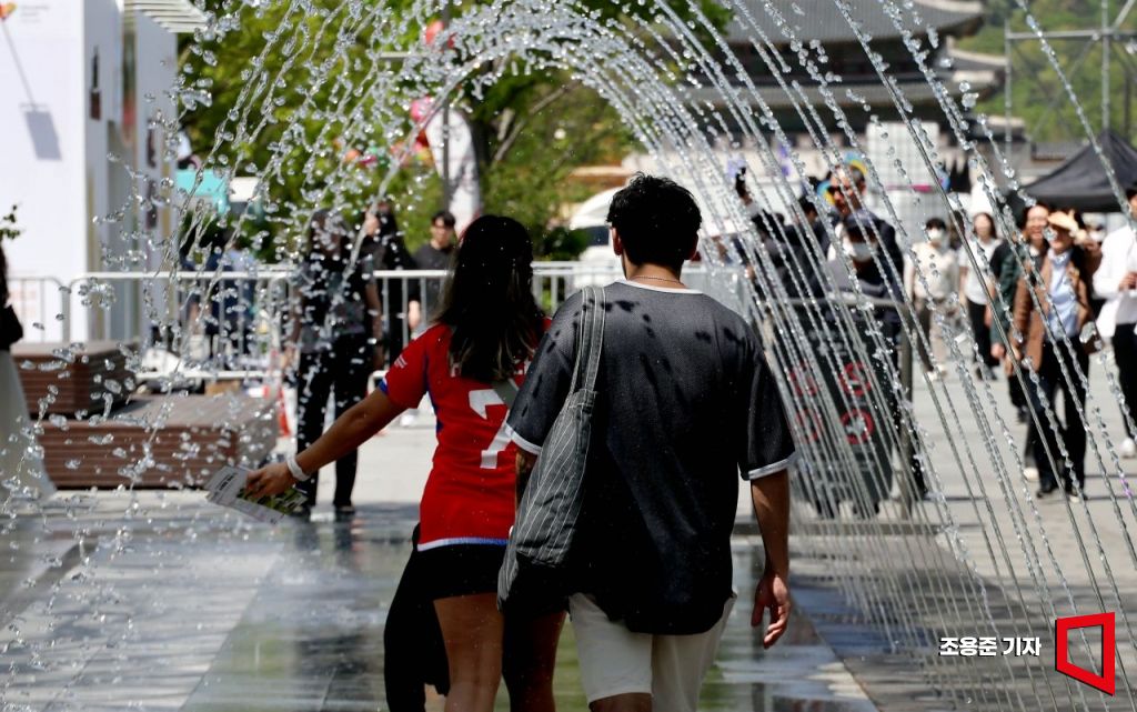 서울 낮 기온이 25도까지 올라간 30일 광화문 광장 분수터널이 시원한 물줄기를 쏟아내고 있다.
