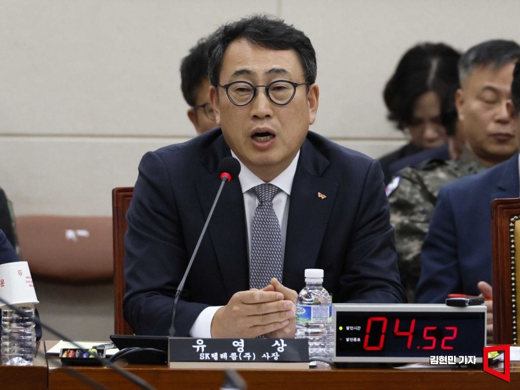 유영상 SK텔레콤 대표이사가 30일 국회 과학기술정보방송통신위원회의에서 열린 방송·통신 분야 청문회에서 의원 질의에 답변하고 있다. 김현민 기자