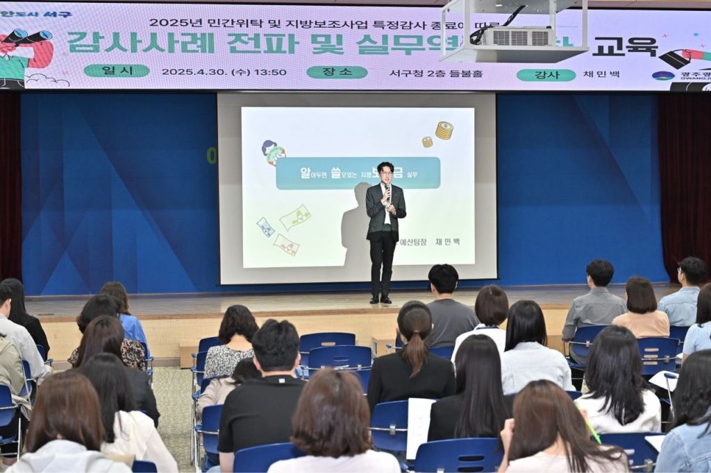 광주시 서구(구청장 김이강)는 30일 서구청 들불홀에서 공직자들의 보조금 집행·관리 역량 강화 및 행정 업무 책임감 제고를 위한 '감사사례 전파 및 실무역량 강화 교육'을 진행했다고 밝혔다.