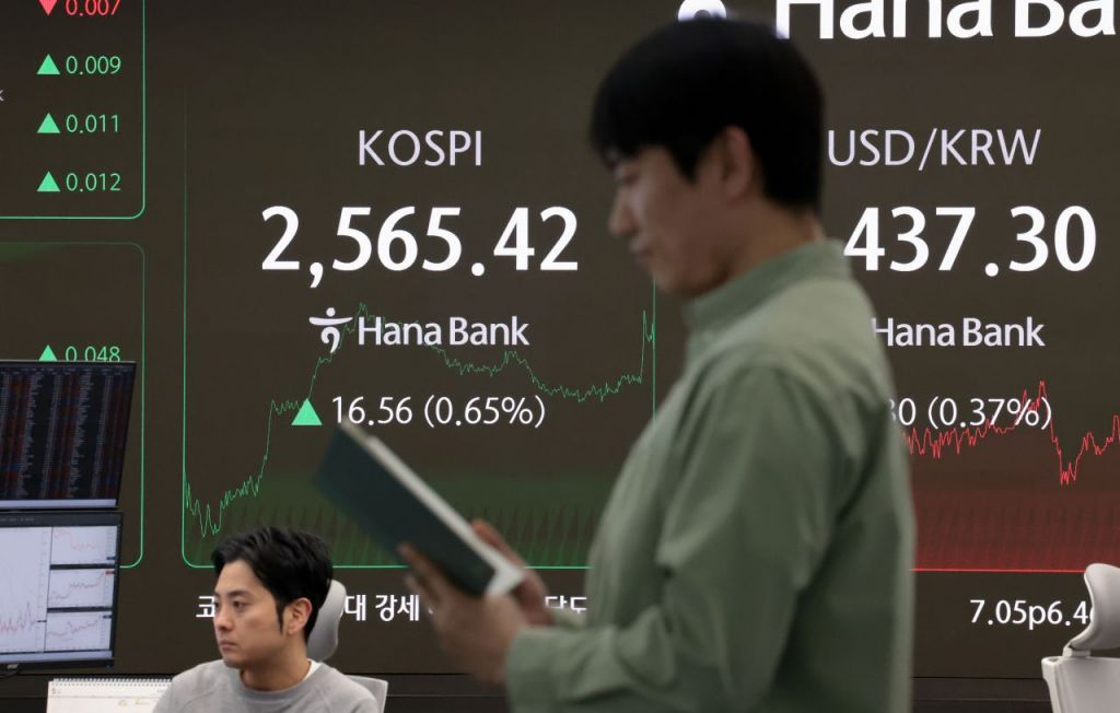 코스피 지수가 전장보다 8.81포인트(0.34%) 내린 2,556.61로 마감한 30일 서울 하나은행 본점 딜링룸에서 딜러들이 업무를 보고 있다. 연합뉴스
