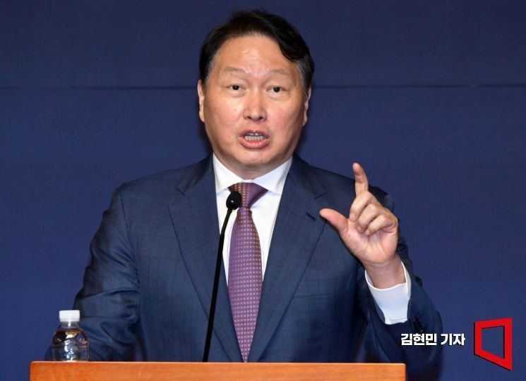 최태원 SK그룹 회장(대한상공회의소 회장)이 지난 22일 서울 여의도 국회 사랑재에서 열린 국회 미래산업포럼 발족식에서 강연하고 있다. 김현민 기자