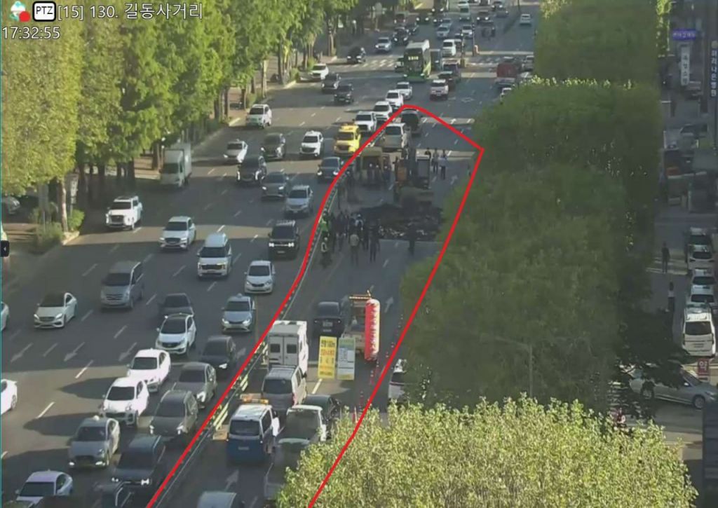 30일 강동구 성내동 길동사거리에서 지반침하가 발생해 복구 작업 중이다. 서울교통정보센터(TOPIS) 캡처