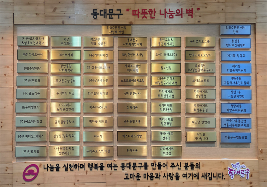 개인 및 사업체는 1000만 원 이상, 단체는 1500만 원 이상 기부 시 게시 대상이 된다. 올해부터는 '따뜻한 겨울나기 사업(24. 11.~25. 2.)' 참여자뿐 아니라 동대문구사회복지협의회, 푸드마켓 · 푸드뱅크 등에 기부한 이들까지 예우 범위를 확대했다.