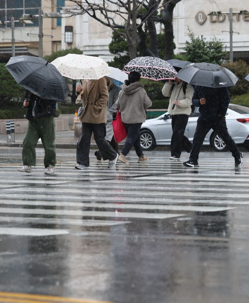전국적으로 봄비가 내린 22일 서울 중구 세종대로를 지나는 시민들이 발걸음을 서두르고 있다. 2025.04.22 윤동주 기자