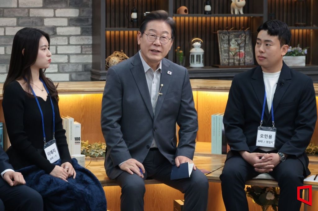 이재명 더불어민주당 대선 후보가 30일 서울 구로구의 한 스튜디오에서 열린 '슬기로운 퇴근생활' 직장인 간담회에서 참가자들과 직장인의 고충에 대해 대화하고 있다. 2025.4.30 국회사진기자단